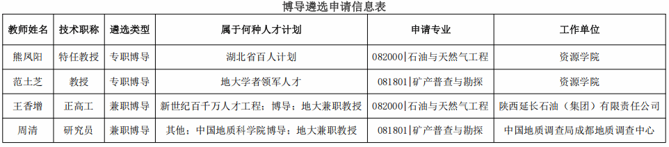 根据学校《关于开展2025年下半年人才类和兼职博士生导师遴选工作的通知》(中地大研发[2025]60号),资源学院学位评定分委员会在召开分会评审前,对资源学院博导遴选申报人申报材料进行公示,在资源学院分会上会的其他招生培养单位申请人材料自行公示。