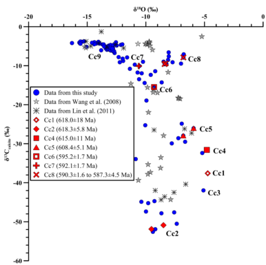 通过详细的岩相学观察和不同期次方解石C-O同位素测试,确定方解石析出次序和C-O同位素特征(图1和图2)。利用U-Pb定年技术对不同期次方解石开展定年研究,确定了九龙湾剖面盖帽白云岩中的13C极端亏损的方解石(δ13C=-51.9‰至-50.9‰)胶结发生在约618.3±5.8百万年前,明显晚于马林诺冰