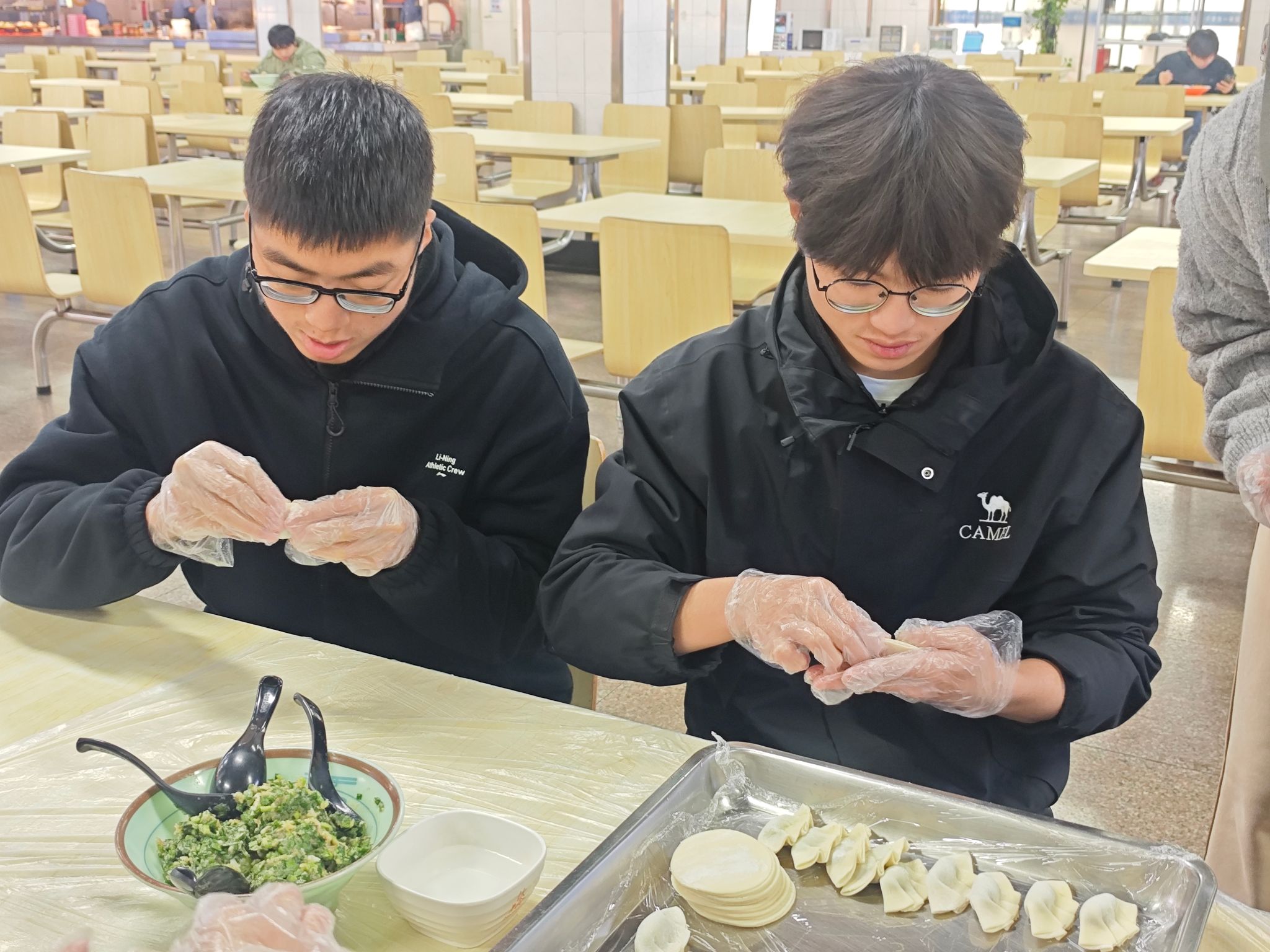 活动现场暖意融融、氛围热烈。400 余张饺子皮分发至四个小组,经验丰富的同学带头示范,新手们积极响应,纷纷亮出包饺子技艺。元宝形、月牙形、麦穗形等形态各异的饺子在大家的巧手下接连诞生。包制过程中,大家围绕南北方冬至习俗、民俗文化内涵展开深入交流,分享“冬至不吃饺子,冻掉耳朵没人管”的趣味俗语,探讨“漏馅不叫漏,叫挣”的吉祥寓意,在欢声笑语中增进了相互了解,党团组织的凝聚力在动手实践中悄然升温。