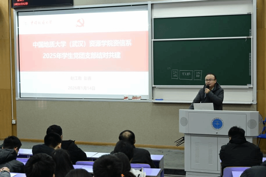 (通讯 赵江南 马俊 摄影 肖文冲)2026年1月14日晚,资源学院资源信息工程系举行“党建带团建、团建促党建、党团共发展”师生联合党团共建启动仪式。资源信息系工程系主任陈建国、系教工支部副书记兼党团联建教师赵江南、副主任兼本科生班主任代表王成彬、辅导员陈宇出席并做指导。地学大数据第一党支部、地学大数据第二党支部全体党员及资源环境大数据工程专业2025级新生,027251班、027252班全体同学参会。会议由地学大数据第一党支部组织委员朱浩天主持。