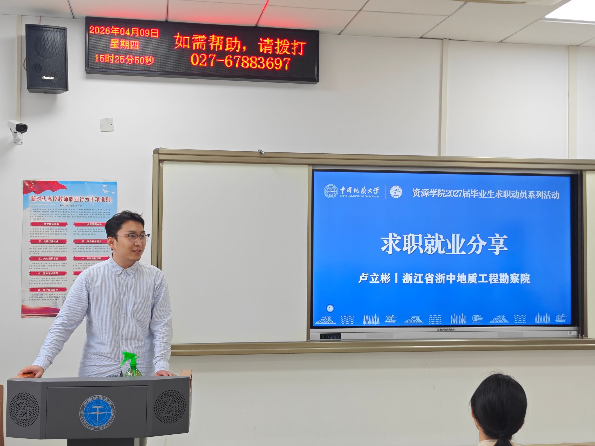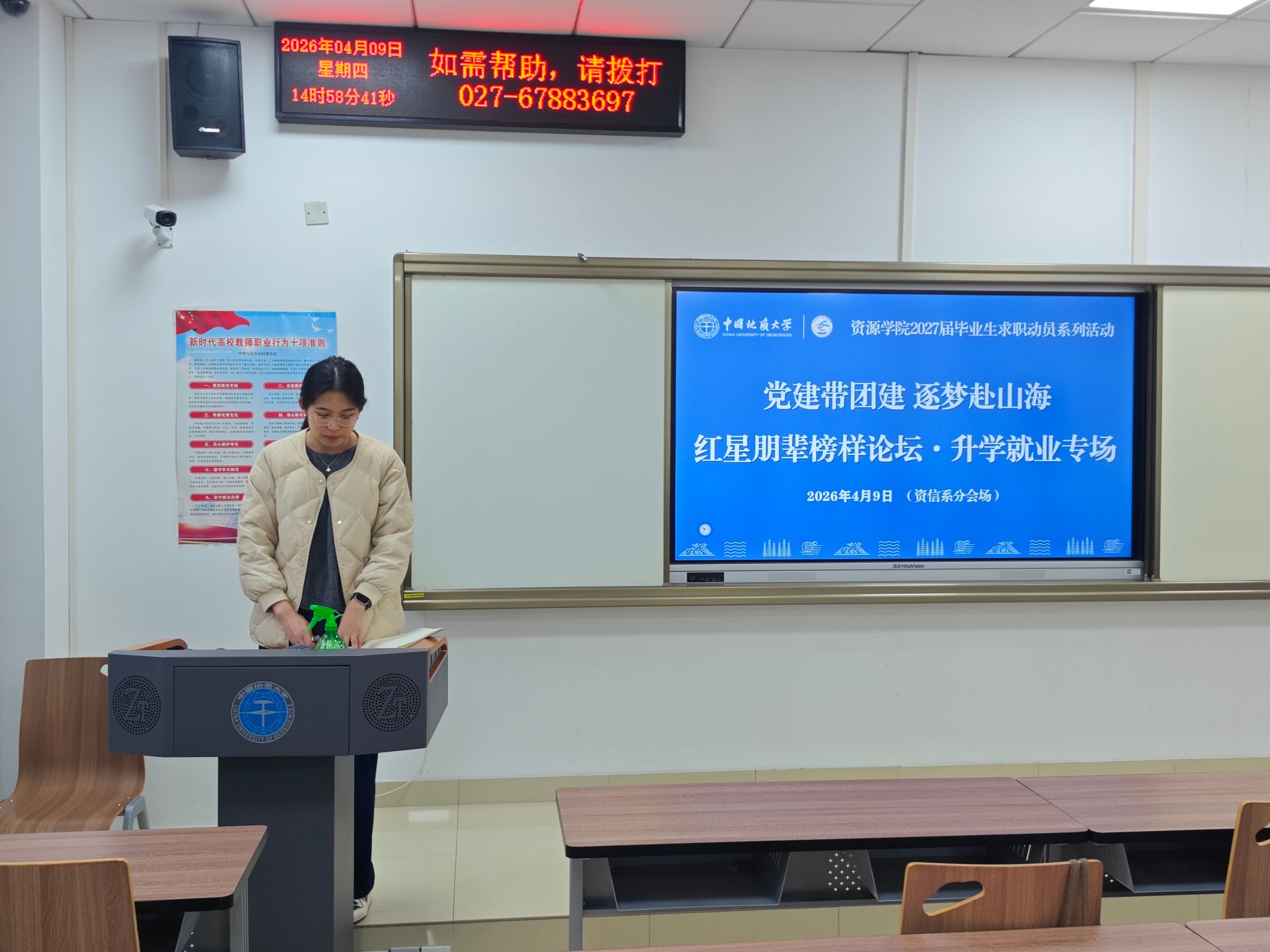 (通讯 吴蕊 摄影 陈思程)4月9日,资源学院资源信息工程系在东教综合楼B110举办红星朋辈榜样论坛·升学就业专题活动。资源信息工程系教工党支部副书记、学生党团联建指导员赵江南,辅导员刘睿,分享代表钟莉、徐焕超、边鹏、卢立彬、刚承儒、唐景杰、王悦颖,以及2023级资源环境大数据专业全体学生参会。会议由地学大数据第一党支部书记马俊主持。