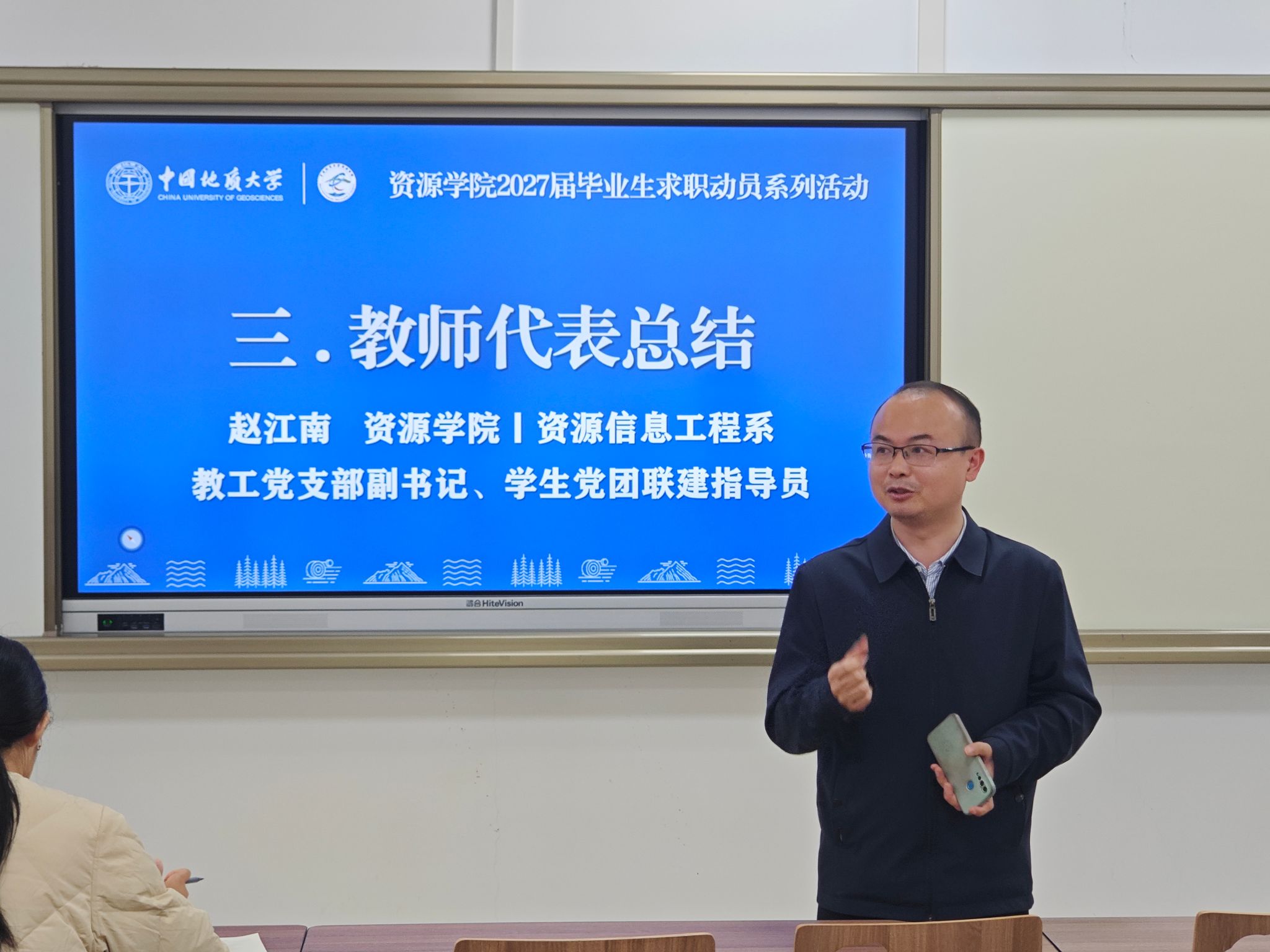 资源信息工程系教工党支部副书记赵江南作总结讲话。他向同学们提出三点建议:一是理性选择发展路径,通过全面自我评估,明确科研深造或直接就业方向;二是科学规划备考与求职安排,客观分析自身优势与不足,针对性补强薄弱环节;三是关注学院政策资源,充分利用各类支持措施,提升求职竞争力。他表示,资信系全体教师将为同学们提供学业答疑、就业指导及保研推荐等全方位支持。