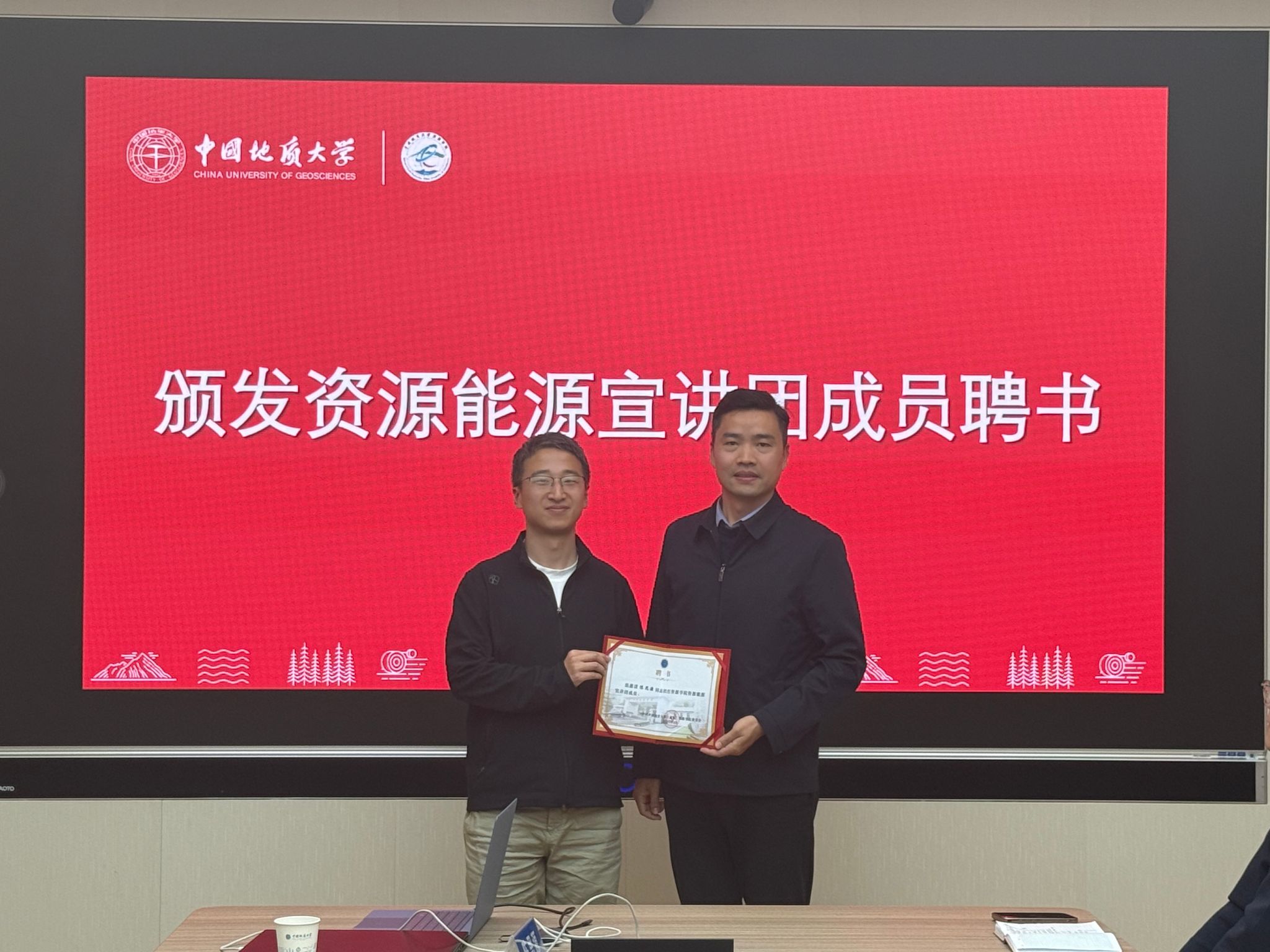 聘书颁发仪式上,学院副院长李占轲现场为陈思源校友颁发资源能源宣讲团成员聘书,聘请优秀校友加入学院宣讲队伍,发挥校友榜样示范作用,持续开展行业科普、经验分享、朋辈引领等育人工作,传承地质报国的精神。