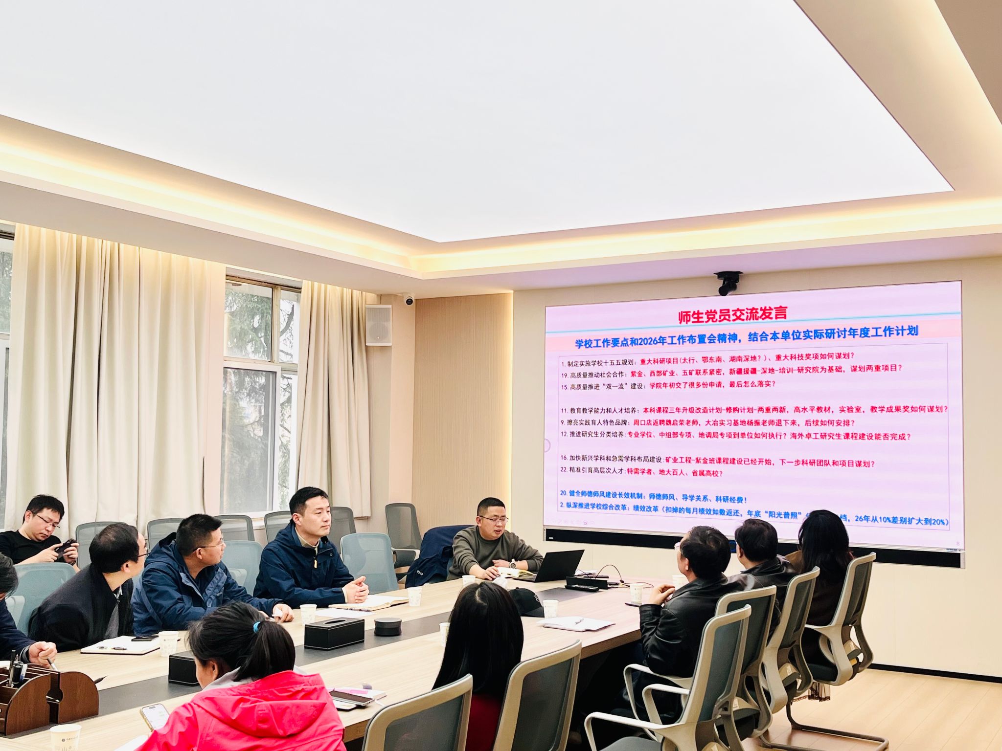 (通讯员 胡新露 赵少瑞)3月26日下午,资源学院资源科学与工程系党支部在主楼330会议室开展支部主题党日。校长李建威为支部教师讲授专题党课,深入解读全国两会精神,围绕树立和践行正确政绩观、推动学校高质量发展作交流分享。党支部书记付乐兵主持会议。