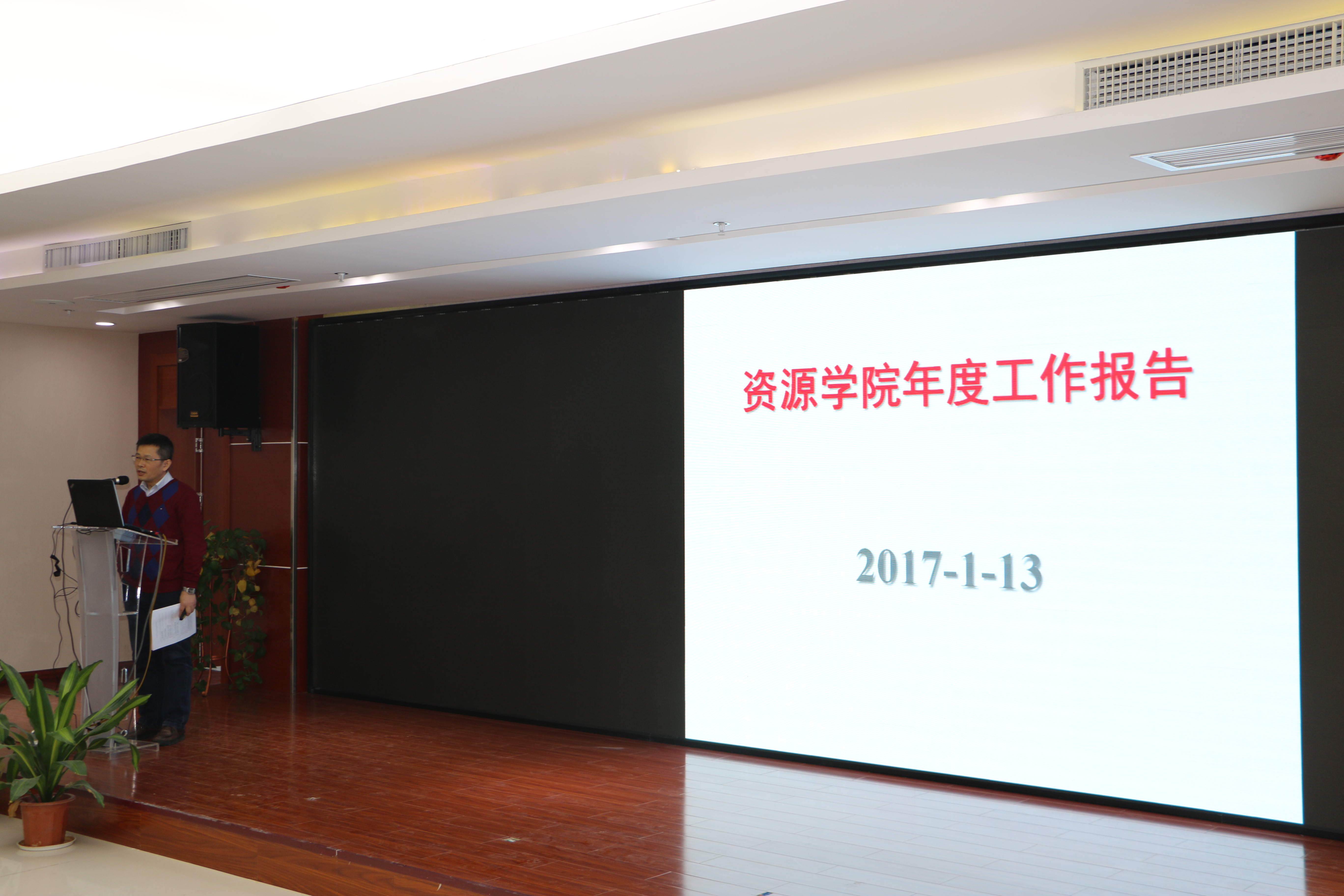 院长李建威作《资源学院2016年工作总结》,报告从严抓本科教学质量、创新提升研究生教学质量、学科及科研工作建设、提升师资队伍建设、提高管理服务水平、深入开展“两学一做”学习教育、学生工作、党风廉政建设等多个方面回顾和总结过去一年来学院各方面的工作和成绩,并梳理了学院目前存在的困难与问题,明确了学院在接下来一个阶段坚持学术导向,学术立院、学术强院的总体思路及工作重点。接着,他向与会代表作了《资源学院2016年财务工作报告》,详细报告了2016年学院的各项经费情况。
